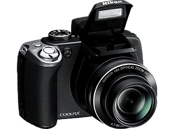 - Objektiv: 18-fach-Zoom-NIKKOR; Brennweite: 4,7 bis 84,2 mm (entspricht 27 bis 486 mm bei Kleinbild); Lichtstärke: 1:2,8 bis 4,5; optischer Aufbau: 14 Linsen in 11 Gruppen; Digitalzoom: bis zu 4-fache Vergrößerung (entspricht 1944 mm bei Kleinbild)