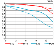 Je höher und gerader die 10 bzw. 30 Linien/mm-Charts, desto höher ist die Güte der Linse.